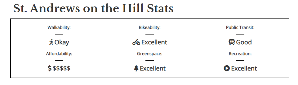 • St. Andrews on The Hill is an affluent family-oriented neighbourhood that has grown up around the landmark St. Andrew’s College, one of the premier boys' private schools in Canada.